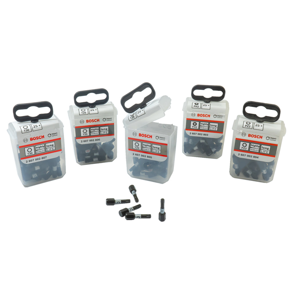 Bei unserem Angebot kannst du zwischen den Abtrieben: T20 / T25 / T30 / PH2 / PZ2 wählen. Die Bits haben eine Länge von 25 mm und werden in einer TicTac-Box geliefert.