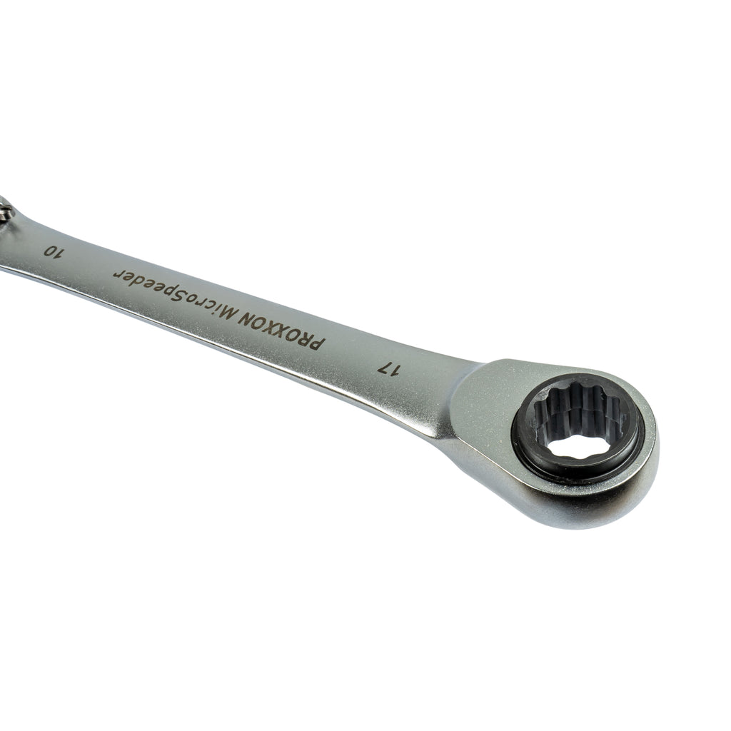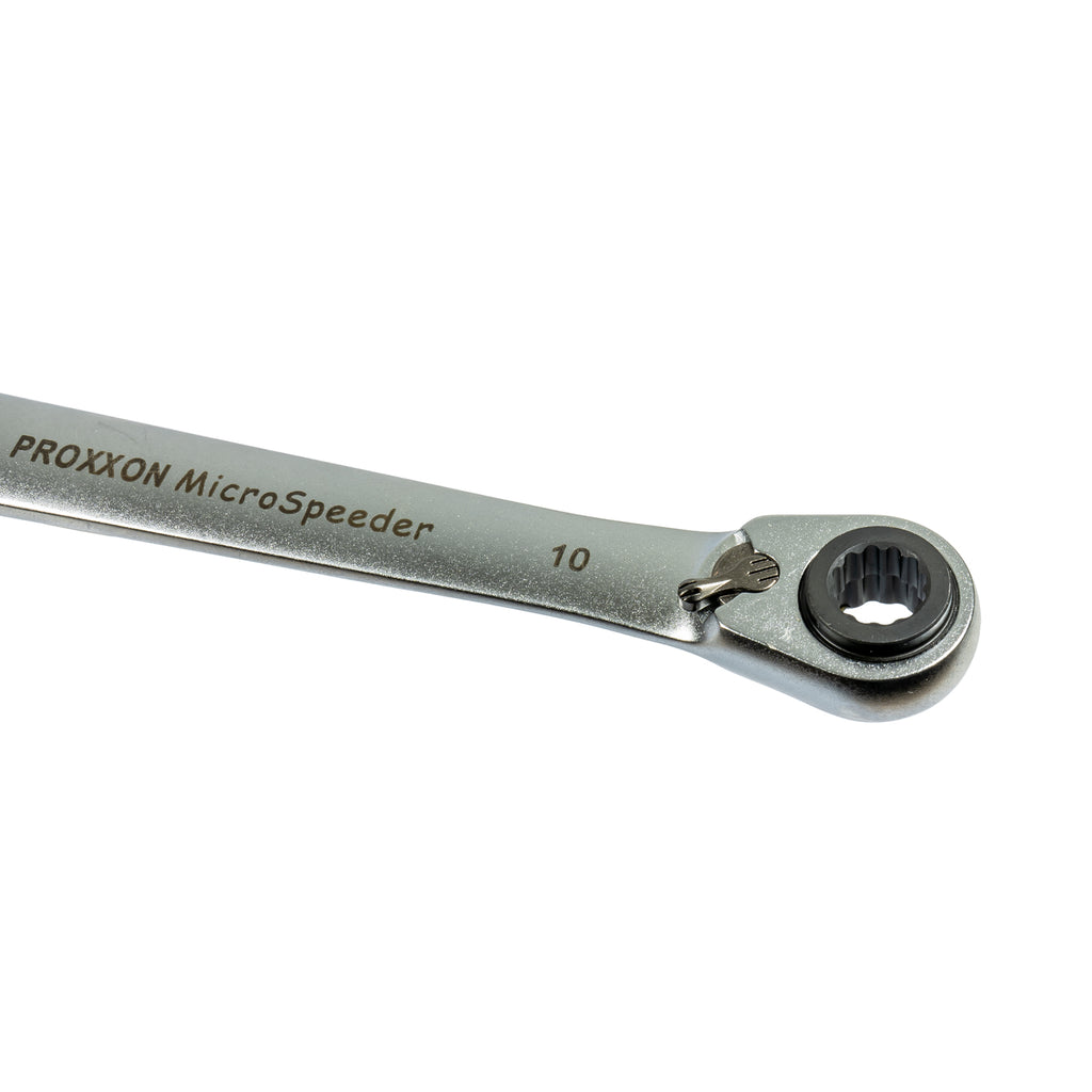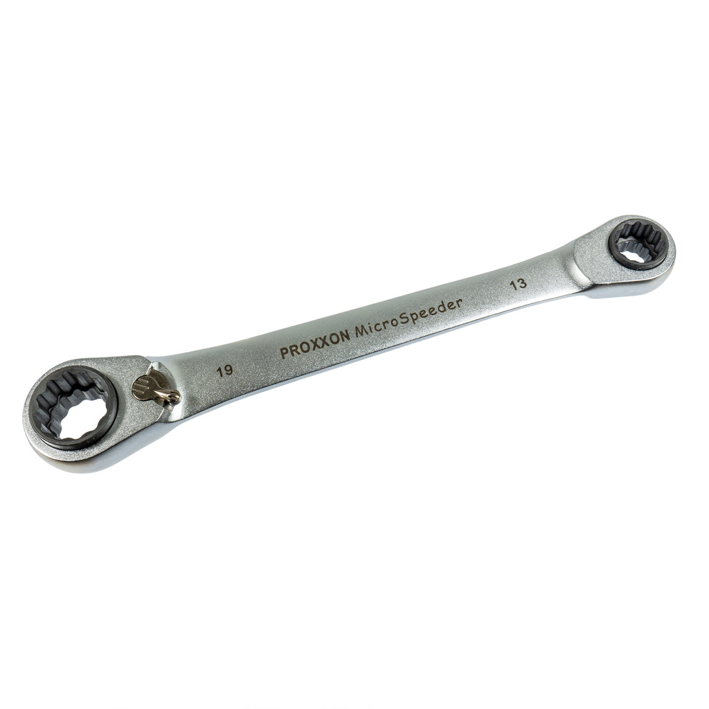 Der Extrem robuste und hochwertige 4-Fach-Ratschenschlüssel MicroSpeeder von Proxxon verfügt über die Schlüsselweiten 10, 13, 17 und 19 mm. Somit benötigt Ihr nur ein Werkzeug für die gängigsten Schrauben z.B. am PKW. Die Größen 13 und 19 mm können Aufgrund der Bauweise des MicroSpeeders nicht durchgesteckt werden.